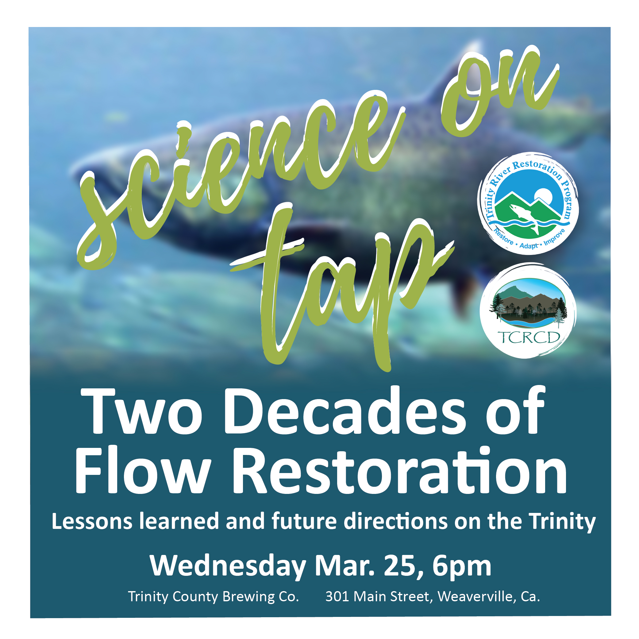 - Mar. 25, 6pm – Science on Tap Seth Naman, NOAA Fisheries “Two decades of flow restoration on the Trinity River: lessons learned and future directions“