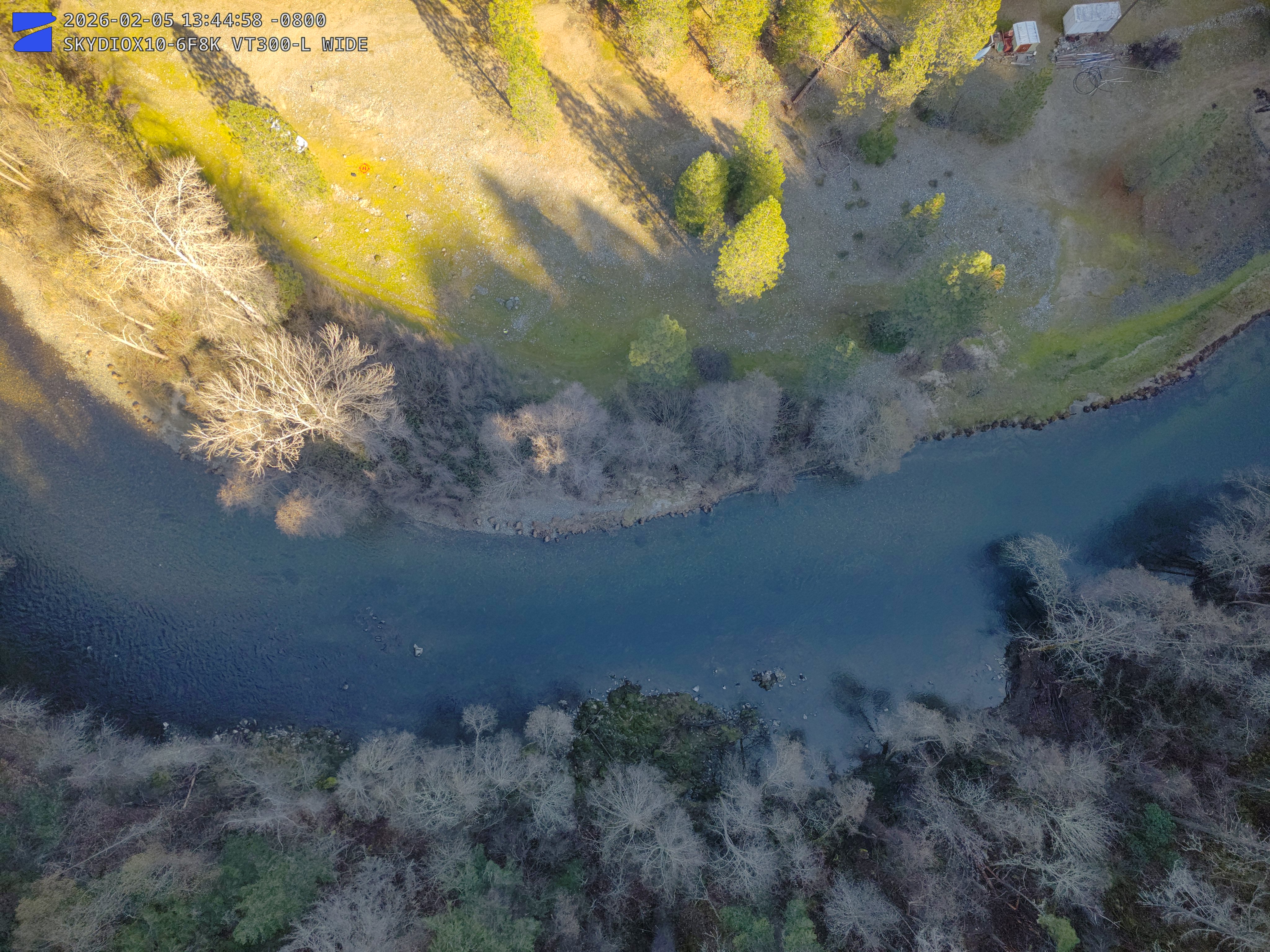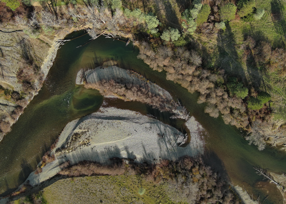 Photo: Drone imagery showing sediment and wood interacting with flow at Oregon Gulch. [Aaron Martin, Yurok Tribal Fisheries Department]
