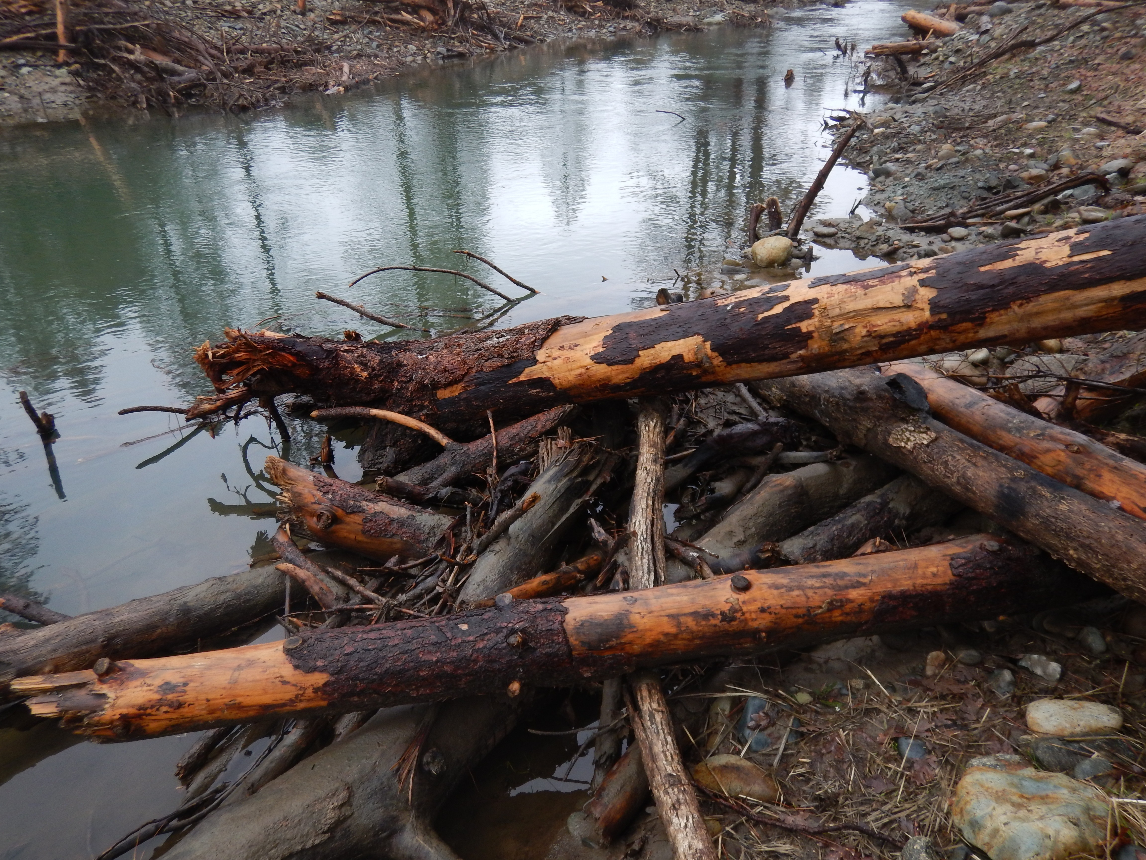In the image to the right, constructed wood jams are forcing flows in two directions encouraging geomorphic change (center right of image), whole trees placed for habitat during construction (lower right), and whole trees being recruited from natural process and bank erosion (upper center).