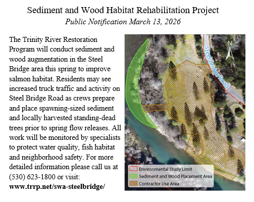 Starting the week of March 16 residents will likely see an increase in traffic, including large trucks on Steel Bridge Road for hazard tree removal and material & equipment staging. Sediment and wood in-channel work is likely to begin after April 1 and will be completed prior to spring restoration releases from Lewiston dam scheduled for mid-April.
